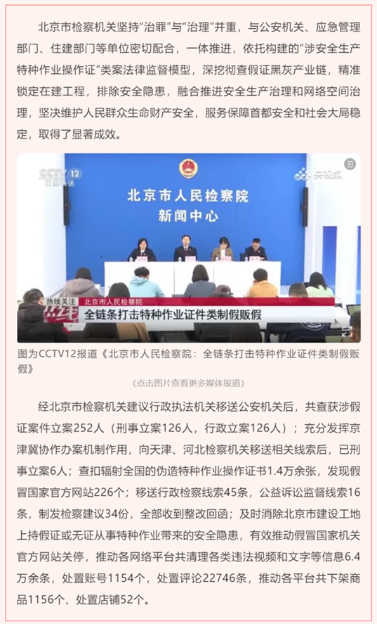 3月8日,最高人民檢察院黨組書記、檢察長應(yīng)勇在第十四屆全國人民代表大會第二次會議上作最高人民檢察院工報告,報告中著重提到關(guān)鍵詞特種作業(yè)假操作證溯源治理工作及成效。據(jù)報告顯示,北京檢察機(jī)關(guān)深挖辦案中發(fā)現(xiàn)的涉及上萬張?zhí)胤N作業(yè)假操作證問題,推動查辦制販假證人員126人,督促主管部門落實監(jiān)管責(zé)任,溯源整治假冒國家機(jī)關(guān)官方網(wǎng)站226個。