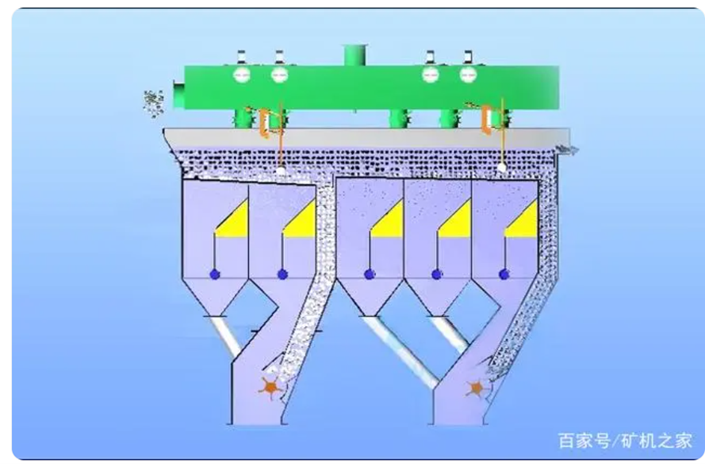 在篩板上的已經按相對密度分層的煤和矸石,受到沖水的作用,逐漸向跳汰機的排料端移動,當到達矸石段的排料閥門時,矸石就經閥門排入機箱,再由矸石提升斗排到機體外。上層的中煤和精煤則在沖水作用下越過溢流堰,進入跳汰機的第二段(中煤段)。在中煤段,中煤和精煤在脈動水流及沖水雙重作用下,一方面繼續分層,另一方面繼續向第二段排料端移動,當到達中煤排料閥門時,中煤又經過閥門排入中煤段機箱內,再經中煤提升斗排到機體外。精煤則越過中煤段的溢流堰隨水流出跳汰機,經溜槽至脫水篩進一步脫水。完成跳汰選煤。