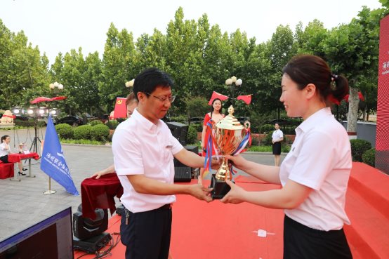 總裁桑鶴明為一等獎(jiǎng)獲獎(jiǎng)單位頒發(fā)冠軍大獎(jiǎng)杯。