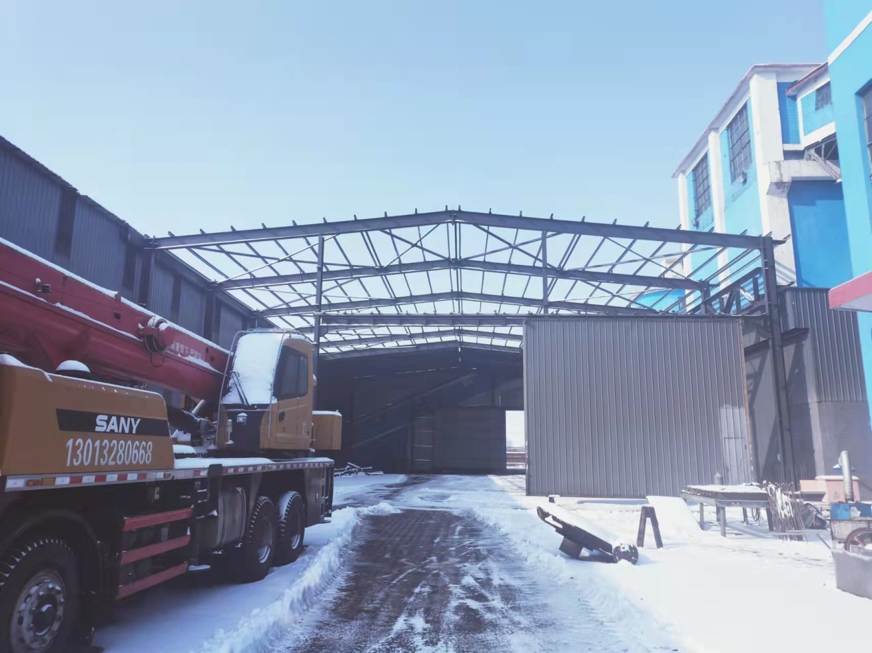 ①為達到環保要求,施工人員冒雪搭建封閉式原煤存儲倉。