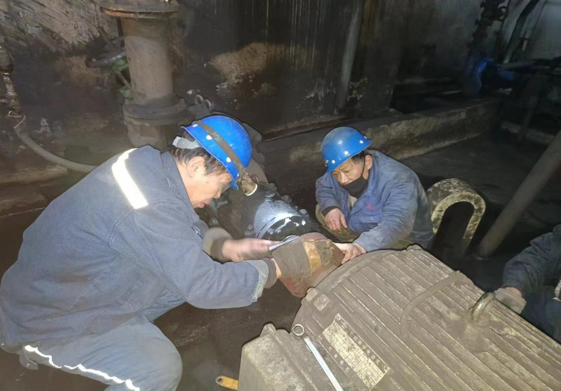 鉗工對308斗子進行更換、車間三層矸石皮帶入口處進行清理