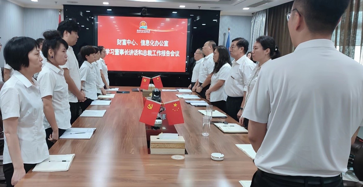 2023年8月25日下午13:30財富中心聯合信息化辦公室全體員工在萬達會議室召開學習了董事長講話和總裁工作報告專題會議。會議由集團副總裁高曉春主持,全體參會人員起立背誦“海明人精神”后,會議正式開始。