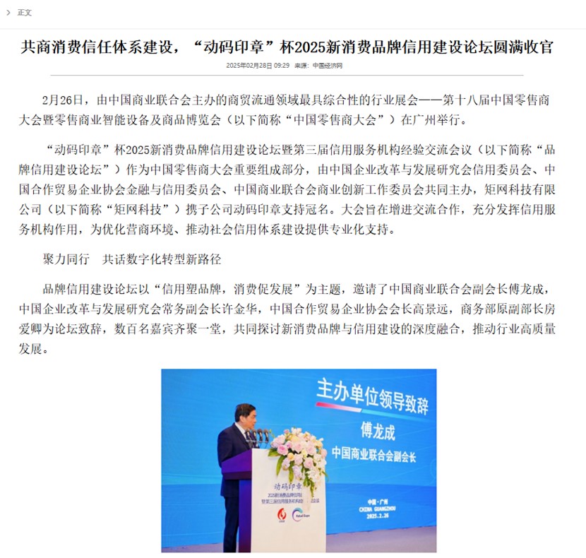 2月26日,由中國商業聯合會指導,矩網科技攜子公司動碼印章支持冠名的“‘動碼印章’杯2025新消費品牌信用建設論壇暨第三屆信用服務機構經驗交流會議”在廣州圓滿收官。論壇以“信用塑品牌,消費促發展”為主題,匯聚政府領導、行業協會代表、知名企業負責人及信用領域專家學者,共同探討新消費時代下品牌信用建設的新路徑與行業規范發展。