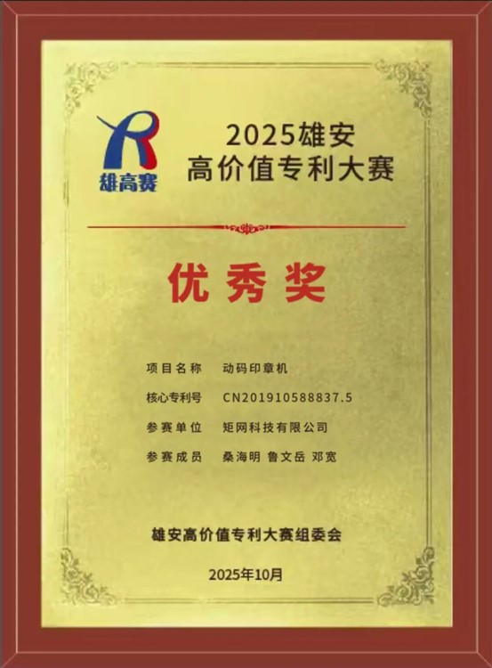 10月22日,推進(jìn)京津冀知識(shí)產(chǎn)權(quán)高質(zhì)量發(fā)展暨2025·雄安高價(jià)值專(zhuān)利大賽頒獎(jiǎng)活動(dòng)在雄安新區(qū)舉行。矩網(wǎng)科技有限公司的創(chuàng)新項(xiàng)目——動(dòng)碼印章機(jī),在京津冀三地182個(gè)優(yōu)質(zhì)參賽項(xiàng)目中脫穎而出,榮獲大賽優(yōu)秀獎(jiǎng)。