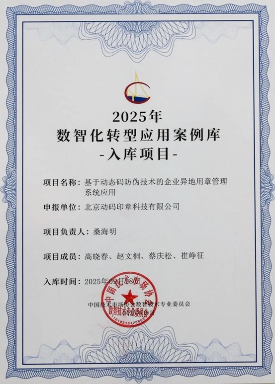 會議現場,矩網科技當選中國技術市場協會數智技術專業委員會委員單位,動碼印章“基于動態防偽技術的企業異地用章管理系統應用項目”榮耀入選2025年中國技術市場協會數智化轉型優秀案例。數智化是企業實現轉型升級的關鍵路徑,對于異地分支機構多的企業,傳統異地用印實體章郵寄費時耗成本、人工保管攜帶易引發私蓋盜蓋風險,動碼印章針對這些痛點提出突破性解決方案。