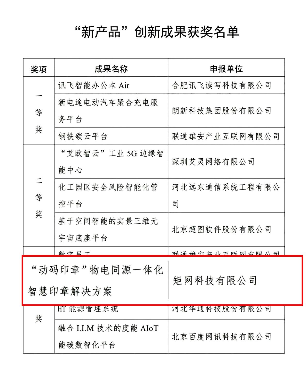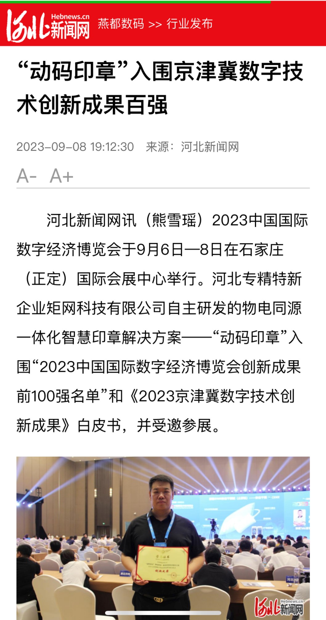 “2023中國國際數字經濟博覽會創新成果前100強名單”及《2023京津冀數字技術創新成果》白皮書。矩網科技有限公司自主研發的“動碼印章”成功入圍百強名單和白皮書。