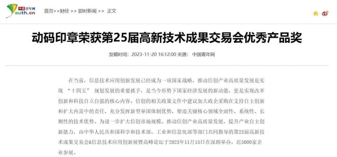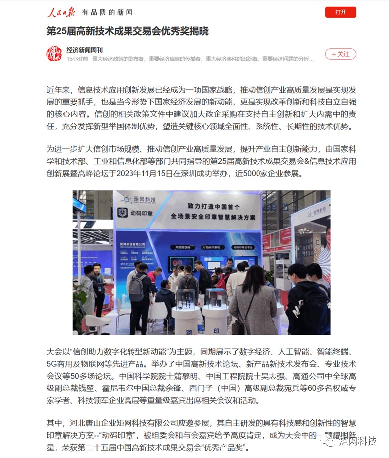 河北唐山企業矩網科技有限公司(以下簡稱“矩網科技”)自主研發的顛覆性創新產品---“動碼印章”榮獲第25屆中國高新技術成果交易會“優秀產品獎”。人民日報客戶端、深圳新聞網,中國青年網、中國日報網、CCTV證券、未來網財經、界面新聞、中國財富網、燕趙晚報等數十家權威媒體進行報道,高度認可動碼印章實現全場景安全用章的科技創新。
