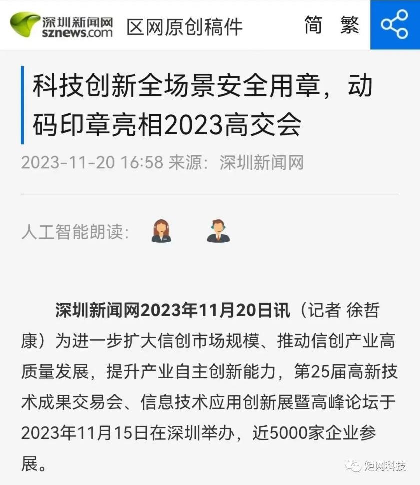 目前,動碼印章已獲得多項國際國內專利、軟件著作權和商標等知識產權。在信創產業融合及數字化轉型升級大勢所趨的當下,動碼印章作為物電同源一體化智慧印章解決方案,有利于推動社會各領域實現高效協同和安全發展,是我國邁向新時代高質量發展的重要驅動力之一,是構建“數字中國”的新動能。“廣闊天地,大有作為”,作為一家高新技術企業,矩網科技將秉承“讓天下沒有假章、讓用章安全快捷”的使命,持續借助高交會這樣的大“舞臺”開展行業交流與合作,吸收養分,與時俱進,開拓創新,為推動數字安全事業的發展和社會主義現代化科技強國的建設貢獻力量。